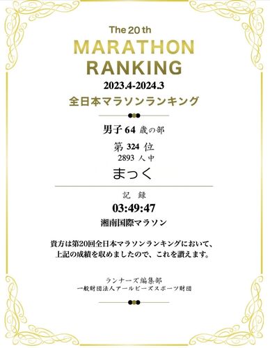4年ぶりに走ったフルマラソンの結果が、マラソンランキングに反映された。この1歳刻みのランキング、まだ元気だった頃は年令別2桁台を目指して頑張っていたのが懐かしい。 runnet.jp 第324位/2893位 3時間49分47秒 記録は昨年12月の湘南国際マラソンのタイ…