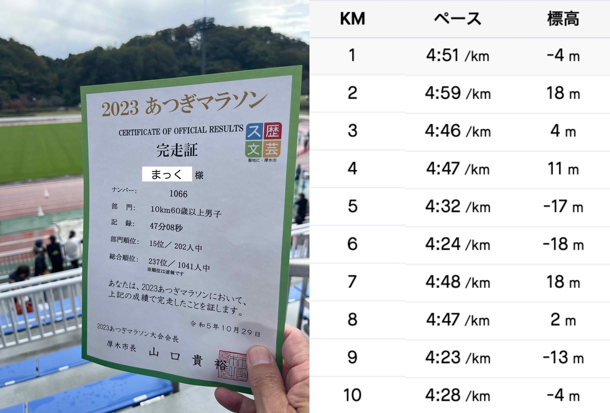 キロ5分のペースで走ろう!と決めていたが、50分を切っていたのでびっくり。記録証(完走証)を受け受け取ってみたら、47分08秒だった。上出来すぎる。部門別順位は15位/202人中という結果だった。