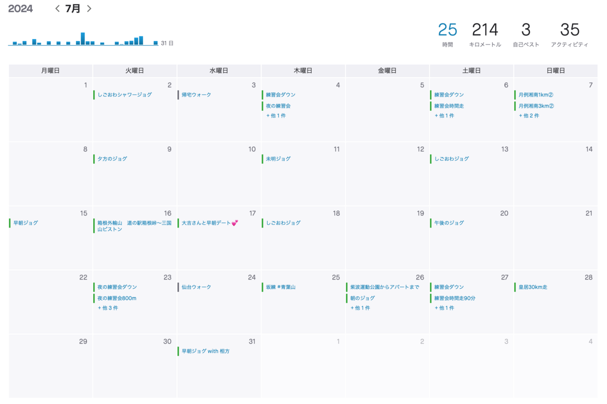 2週続けて土日の休日出勤があったわりには、最低レベルの走行距離を達成することができた。内容的にはジョグがほとんどだが、短めのインターバルから長めのインターバルに加え、時間走、坂練(青葉山)、トレイル(箱根外輪山)など、いつも以上にバラエティにとんだメニューだった。月初めの月例湘南も含め、スピ練ぽいこともできたしね。おかげで疲労が抜けず、いつも疲労困憊状態。
