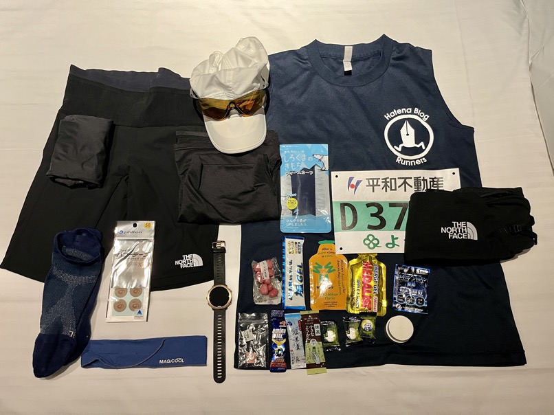 ジェルなどはノースフェイスインパルスショートタイツに収納。 ペーサーベルトを持ってきたが、今回はスマホは持たずに走ることにしたので身につけないことに。暑さ対策はマジクールとランナーズブランドの遮熱・遮光クーリングノースリーブ。脚攣り対策は「無印良品のねりころ梅」と「塩ジェル」、さらにアルギニンを飲んでドーピング😆ロキソニン&胃薬は必須!