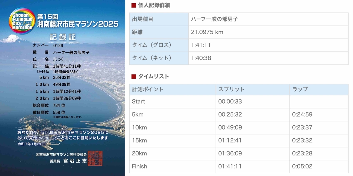 昨年に引き続き、湘南藤沢市民マラソンを走ってきた。今年はハーフの部が新設され、迷わずエントリー。スタート時間が遅れるなどトラブルがあったけど、久しぶりのハーフをとにかく気持ちよく走れた。スタートして1kmは大混雑で予定していたペースで走れず。でも結果的にそれが良かったのかも。5km過ぎの1回目の折り返し地点でオートクルーズのスイッチをON!4分40〜45秒のペースで淡々と走ったよ。最後は100分切り目指して懸命に走ったけど38秒オーバーでゴール。歳とったけど100分カットはまだ目指せるかなぁ。