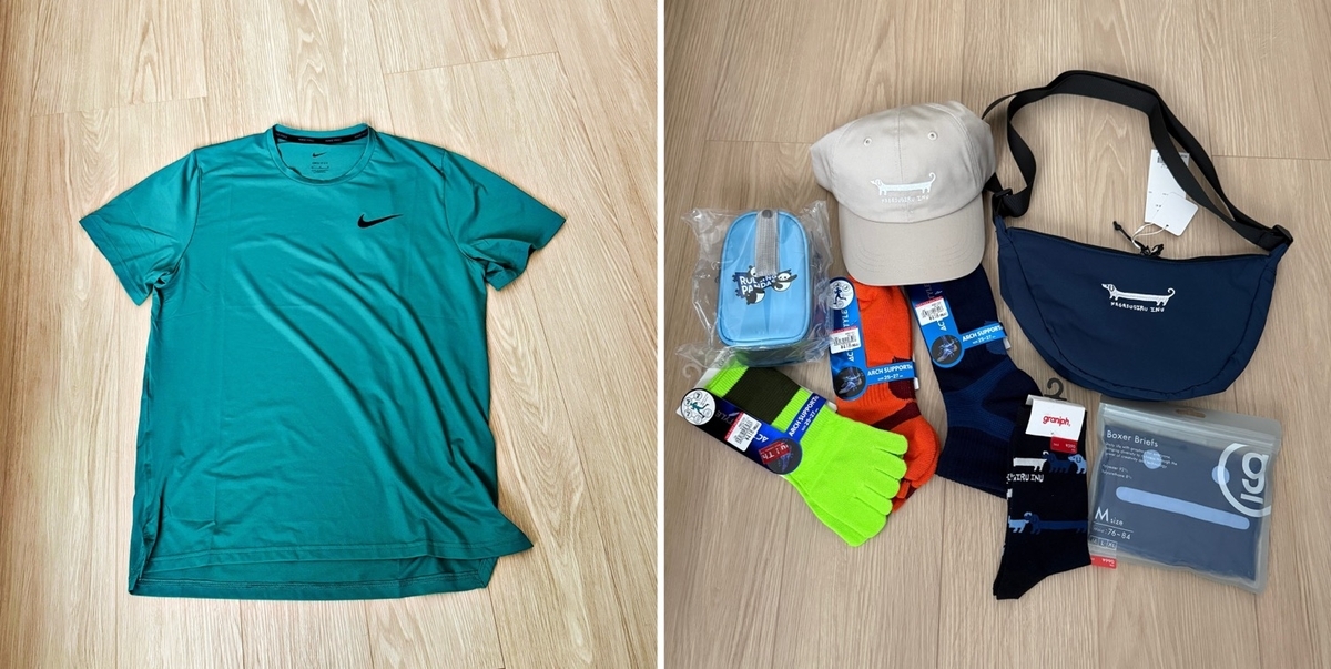 ランTは、背の部分の丈が長いヤツと決めている。最近はソックスはグンゼ。踵の厚みが自分に合っているというのがその理由。グラニフのキャップとミニショルダーバックは相方が購入。自分はソックスとブリーフ。