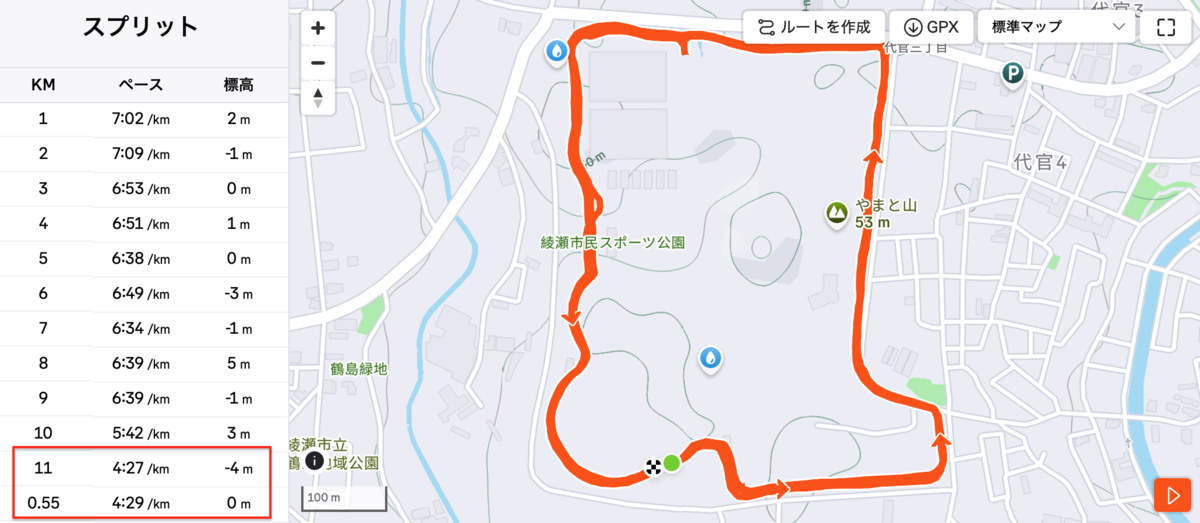 最後は、来週の自分の番(海老名市駅伝競走大会)に備えて2.5kmの距離を体感すべく、選手と同じペースで1周走ってみました。無理をせずキロ4分30秒ペースで刻みましたが、まだ少し余裕があったので、本番ではキロ4分15秒を目標に走り抜きたいと思います!